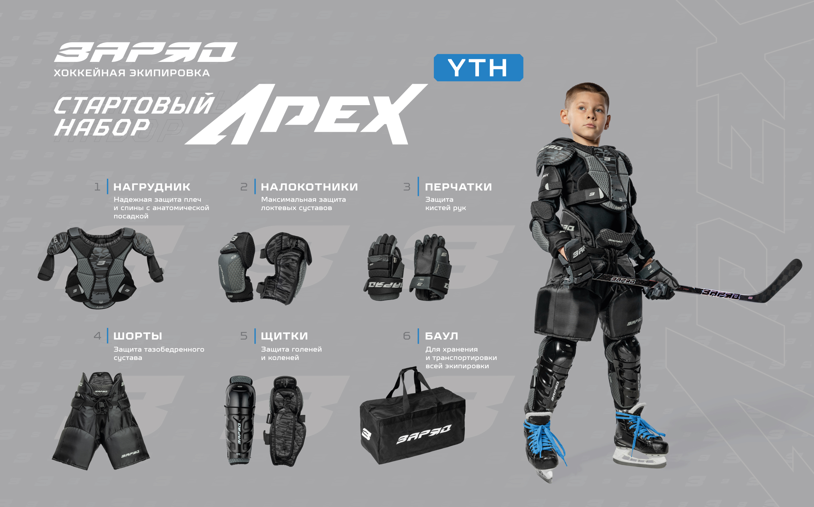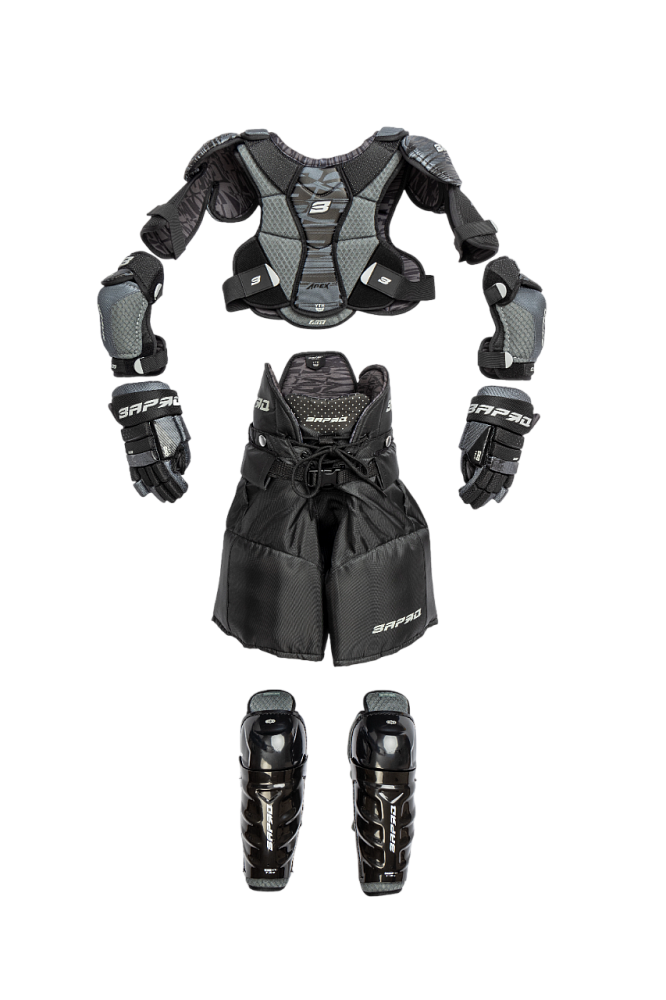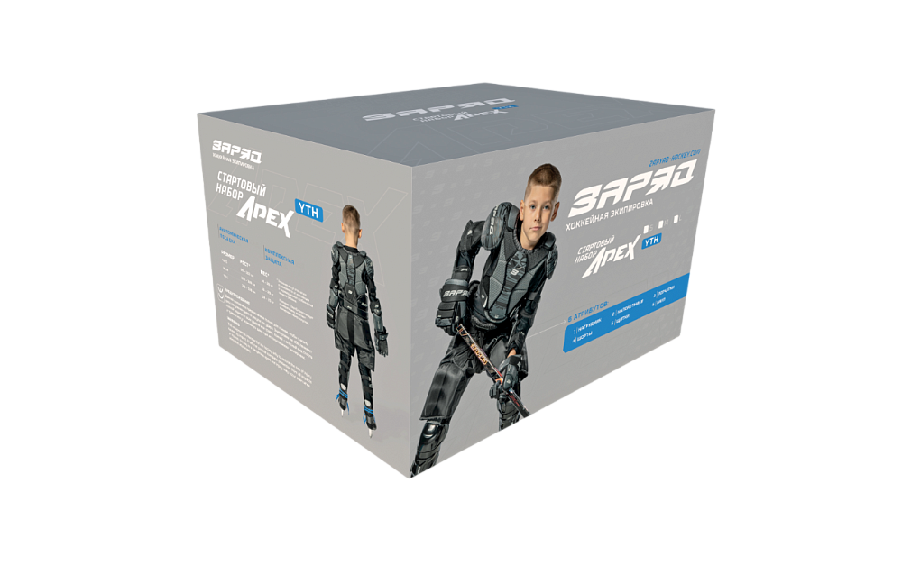 «ЗаряД Apex» — это первый шаг к большим победам в мире хоккея. Специально разработанная линейка для начинающих игроков, сочетающая в себе отличную защиту и максимальный комфорт. В стартовый набор "Apex" входит: нагрудник, налокотники, перчатки, шорты, щитки, баул. Набор представлен в трех размерах: S, М, L.